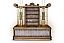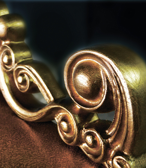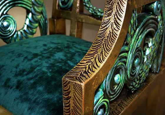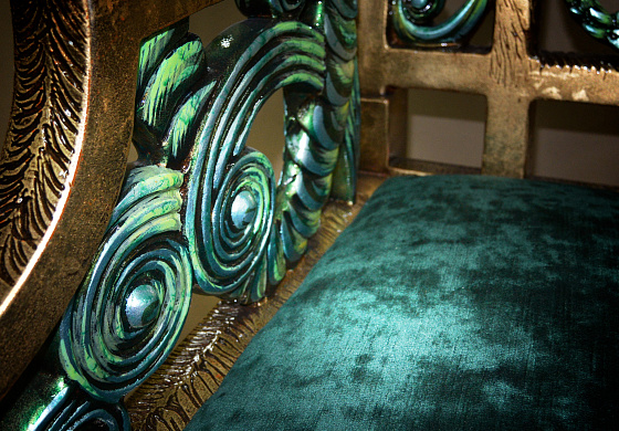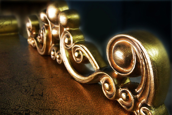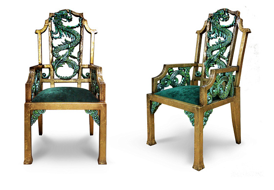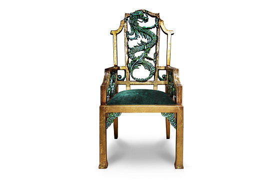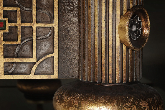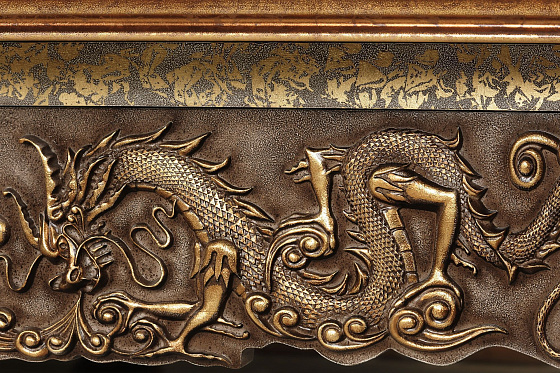 Характерная для «Драконов» форма ног, панно ручной работы в традиционной технике и с традиционным для китайской миниатюры сюжетом, цветы дикой сливы в резных элементах. Выкраска стола многогранна, выполняется вручную, в авторской технике с помощью нанесения золотой потали и многослойной колеровки, с сохранением тонкой стилистики. Фактура и цвет «с отголосками металла» позволяет придать поверхности уникальный вид, рельеф напоминает чеканку.