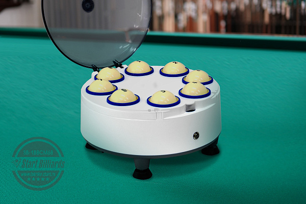 1. Загрузка: Откройте крышку устройства и поместите в отверстия для загрузки (диаметр 70-71 мм) до 8 бильярдных шаров.