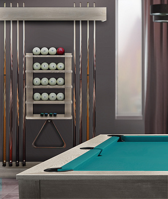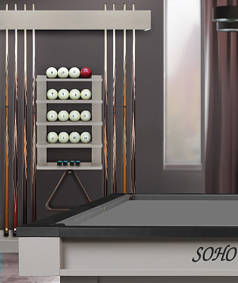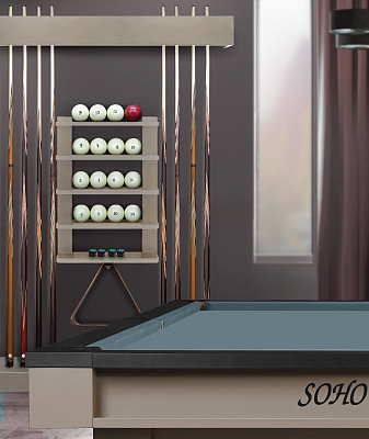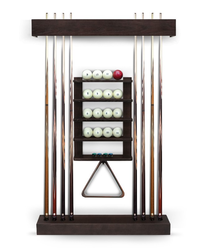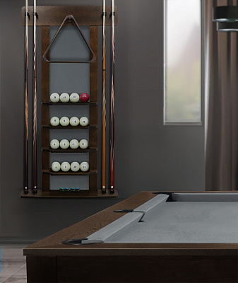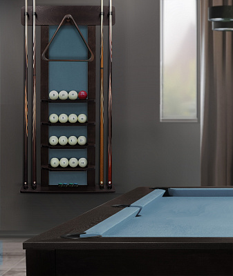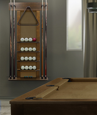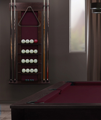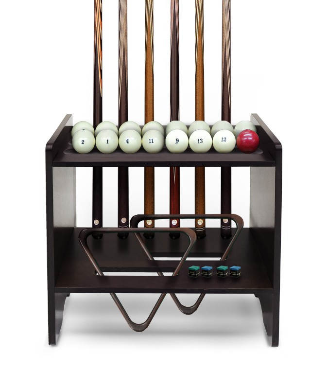 Полки оснащена держателем для треугольника и пятью полками, четыре из которых вмещают полный комплект шаров. На дополнительной пятой полке можно расположить мелки, наклейки, насадки и другие необходимые для игрока аксессуары.