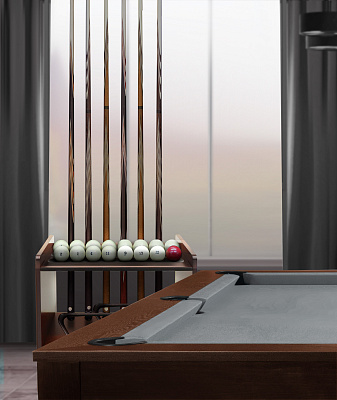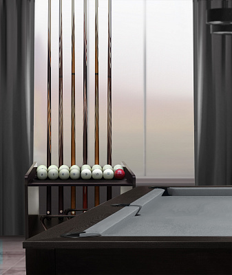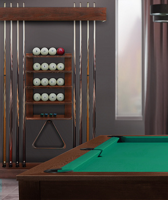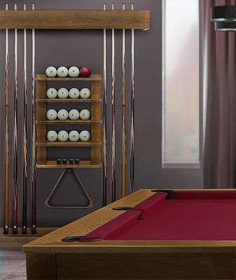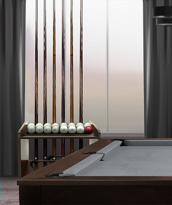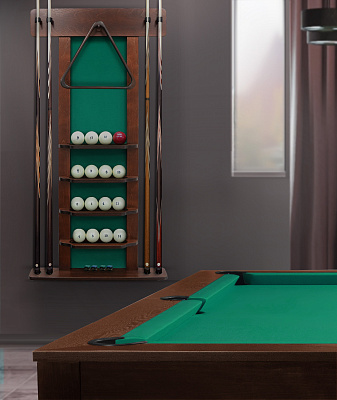 «Аталанта» позволяет разместить все необходимое для комфортной игры: 4 кия, полный комплект шаров, треугольник и мелкие аксессуары для игрока.
